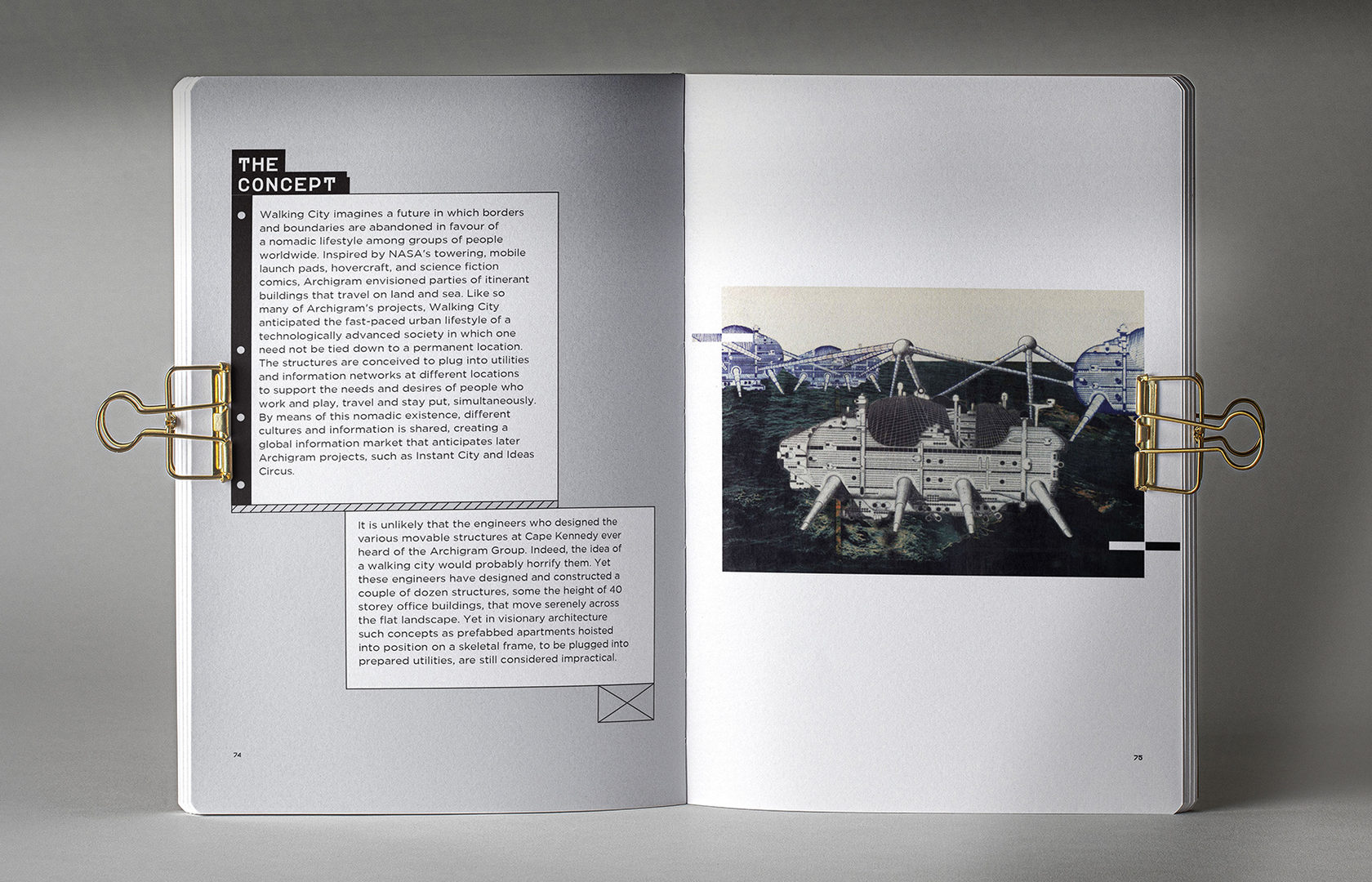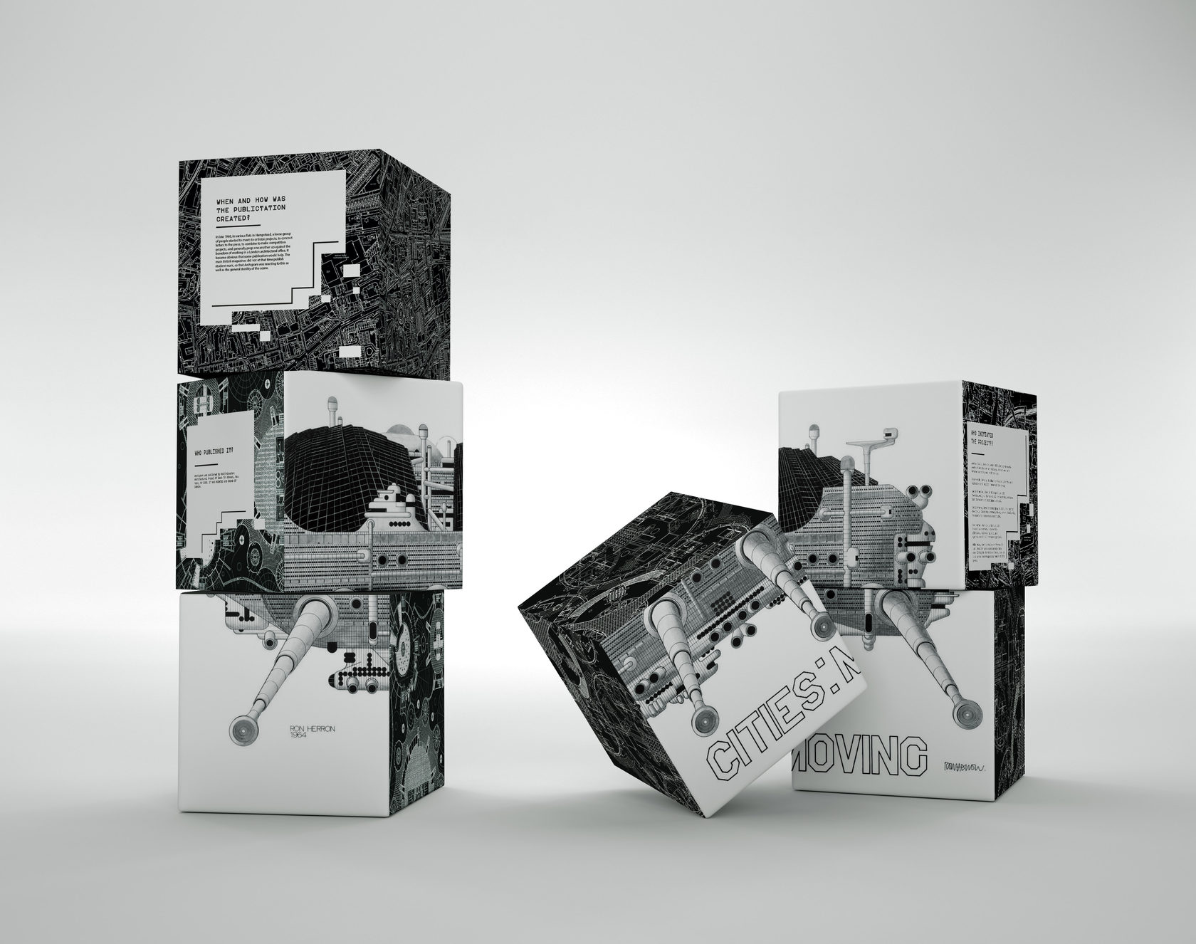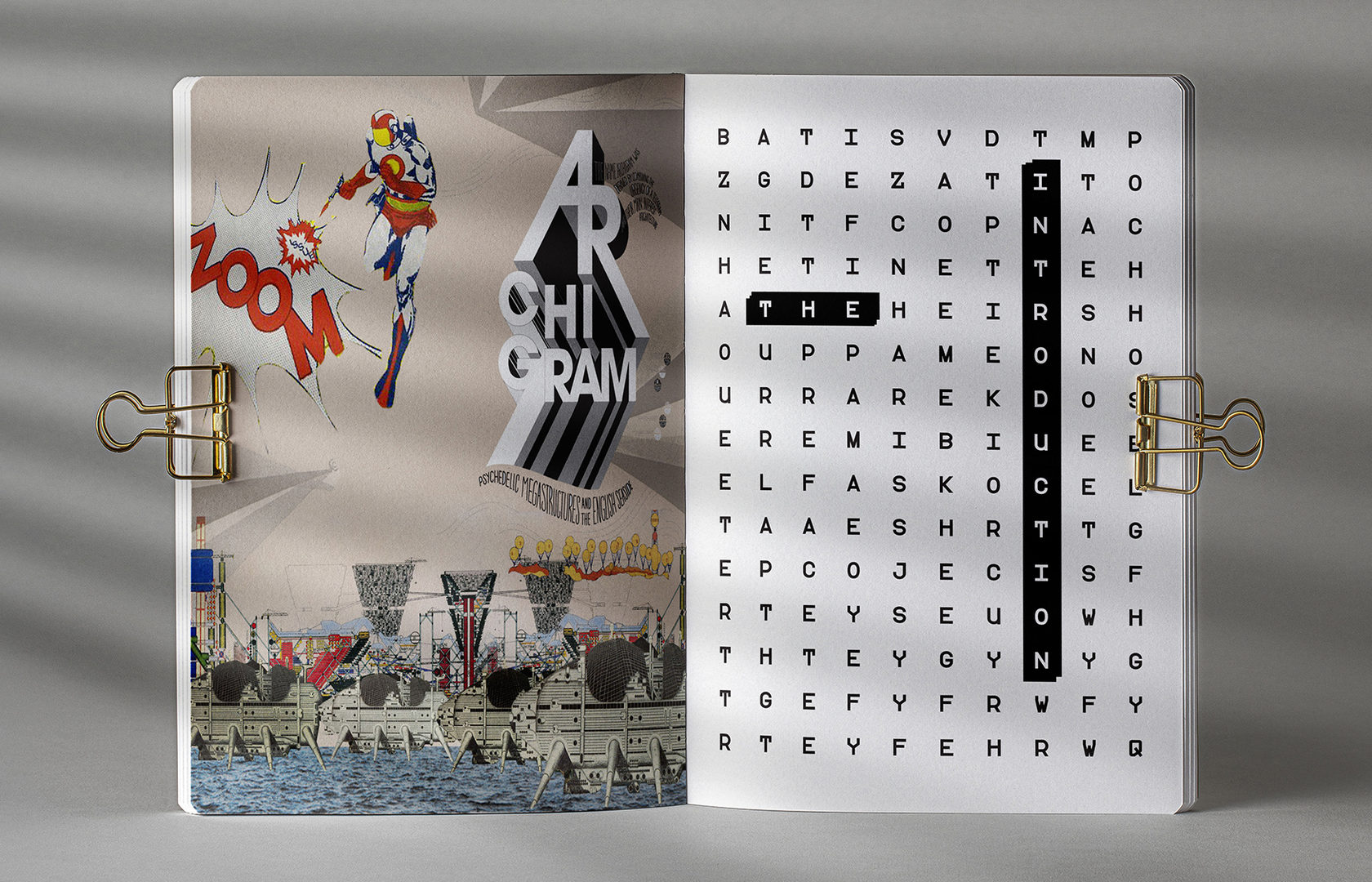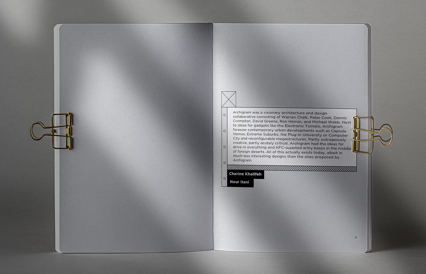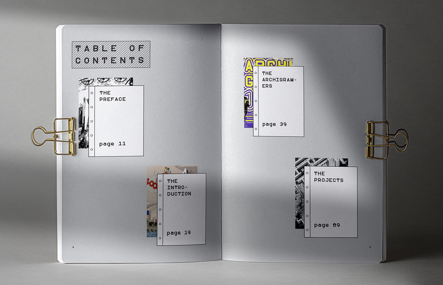 Archigram is a project that was designed to celebrate the architectural movement in ways that enthralled a generation. This architectural concept brought together a three-dimensional displayed introduction to the project and a printed booklet that found a synergy between content and form, and developed the notion of pretext further in another opportunity to be seen and shared. In that purpose, the constructive presentation made of cubes was designed in a manner where each façade contained data of information. Once the cubes were arranged by order, the back introduced a visual of one of the most famous Archigram projects: "The Walking City". The project is then carried out through the Archigram booklet, a companion volume of the informative display. The spirit of this pamphlet translates the material that has been prepared as a performative presentation into the format of a small run, print-on-demand publication, captured within the essential components of colors, linear gestures, compelling graphics and imageries in a fresh new direction.