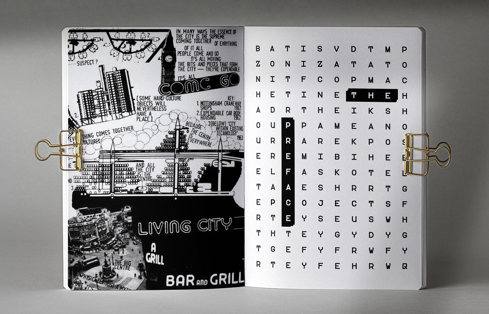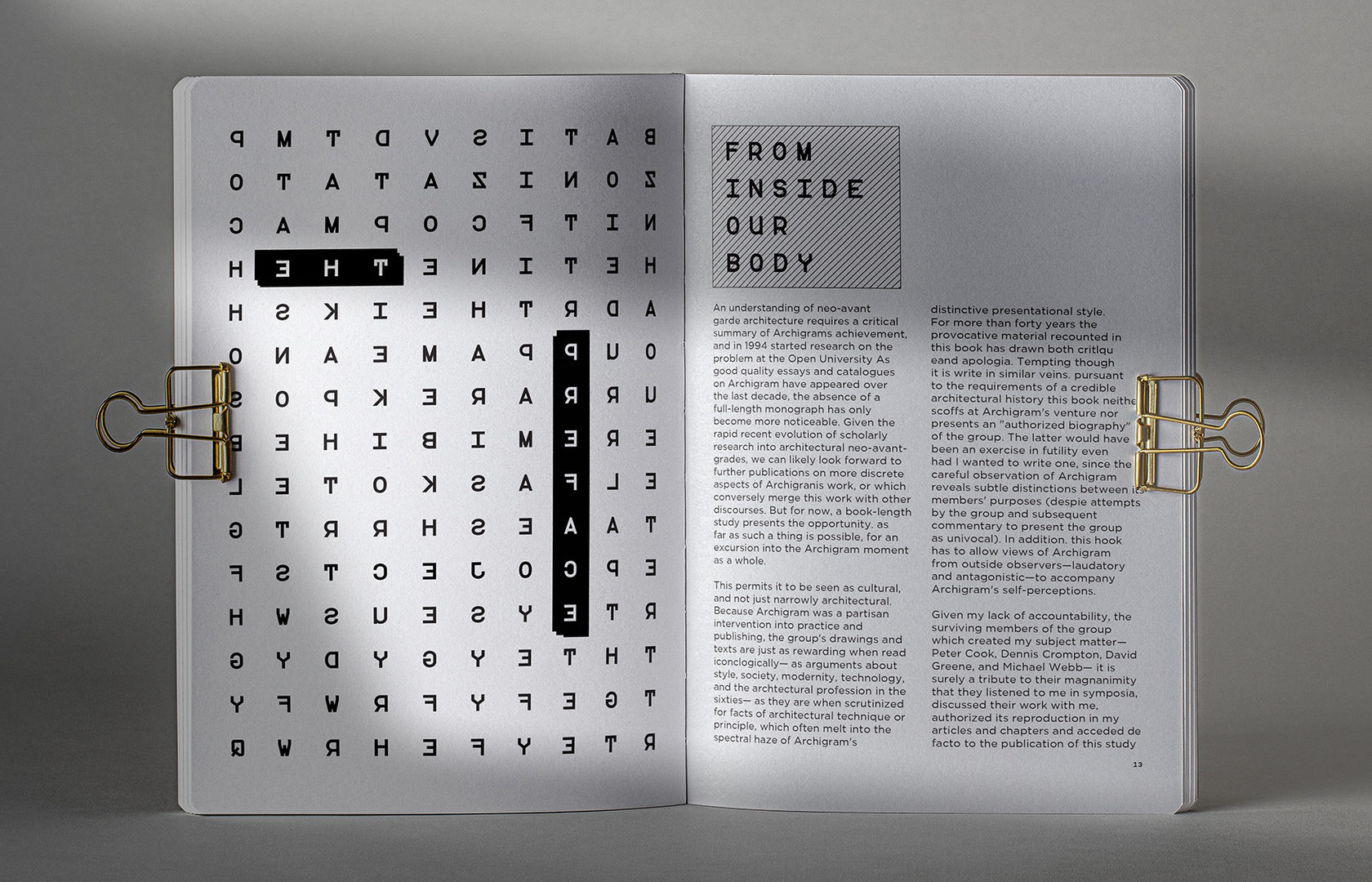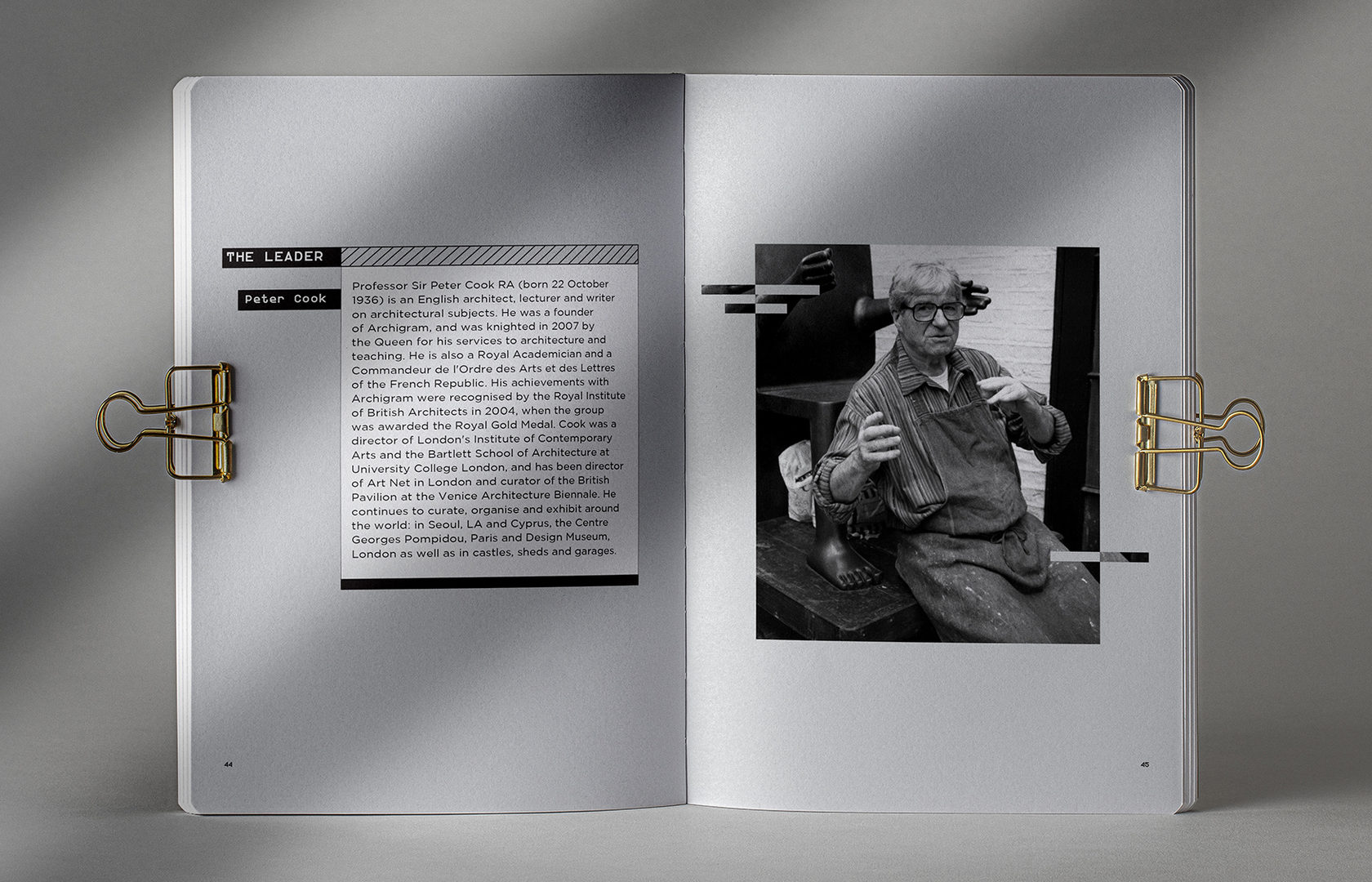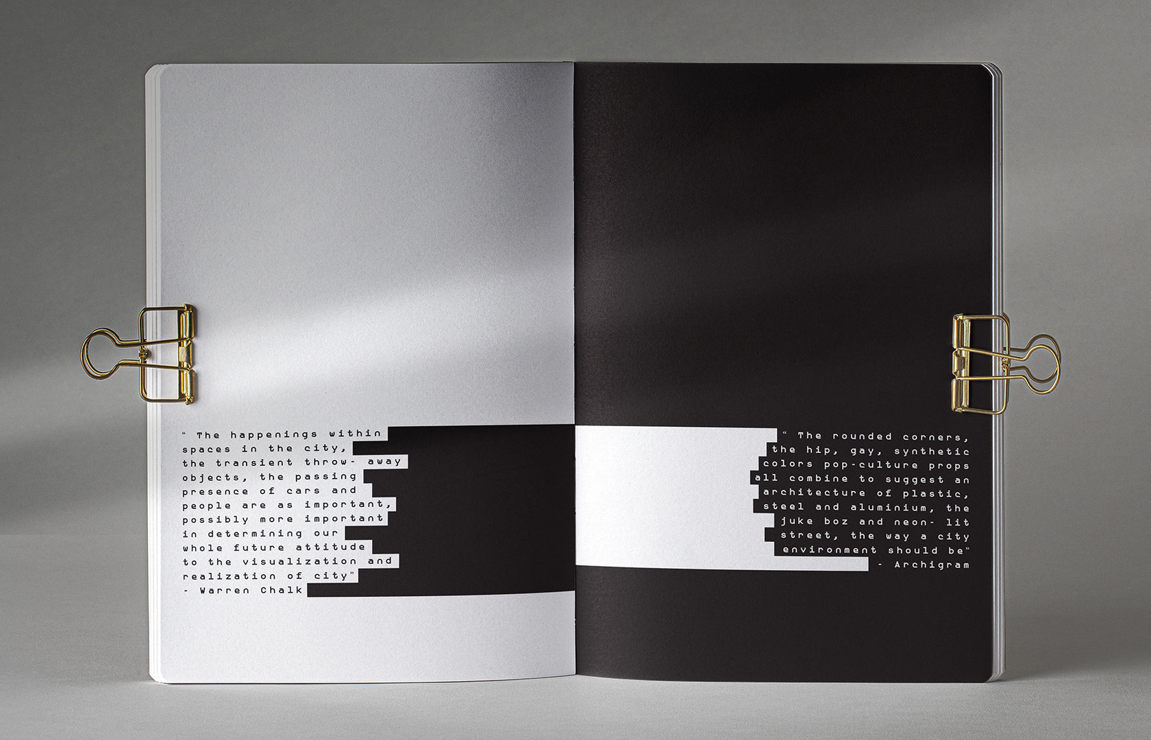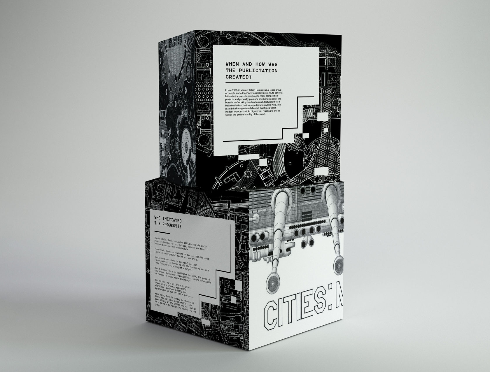 Archigram is a project that was designed to celebrate the architectural movement in ways that enthralled a generation. This architectural concept brought together a three-dimensional displayed introduction to the project and a printed booklet that found a synergy between content and form, and developed the notion of pretext further in another opportunity to be seen and shared. In that purpose, the constructive presentation made of cubes was designed in a manner where each façade contained data of information. Once the cubes were arranged by order, the back introduced a visual of one of the most famous Archigram projects: "The Walking City". The project is then carried out through the Archigram booklet, a companion volume of the informative display. The spirit of this pamphlet translates the material that has been prepared as a performative presentation into the format of a small run, print-on-demand publication, captured within the essential components of colors, linear gestures, compelling graphics and imageries in a fresh new direction.