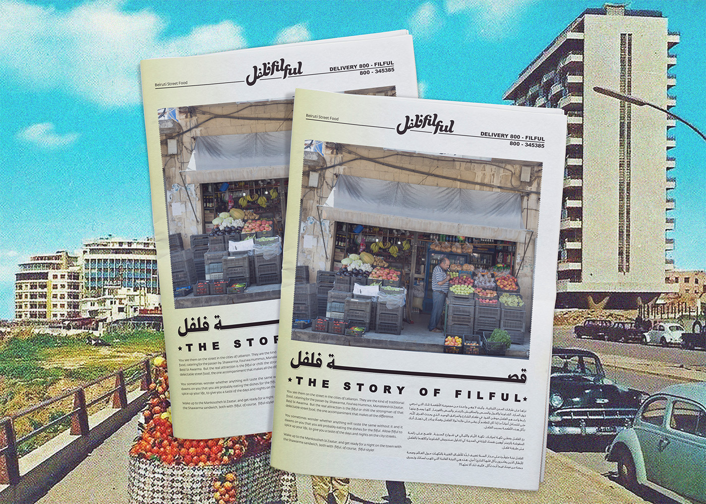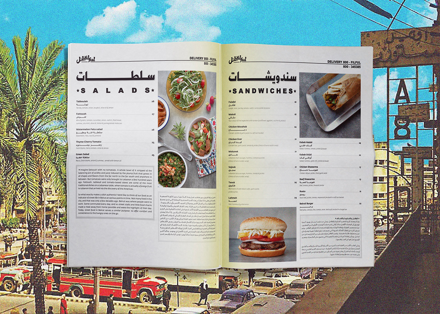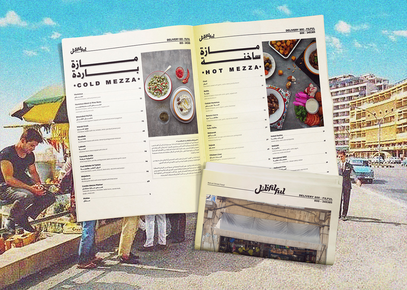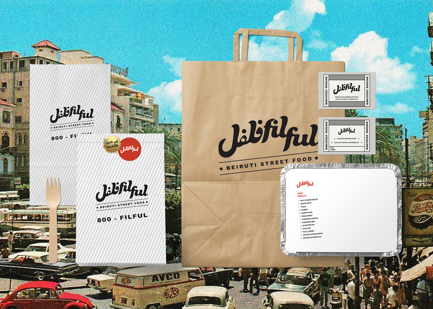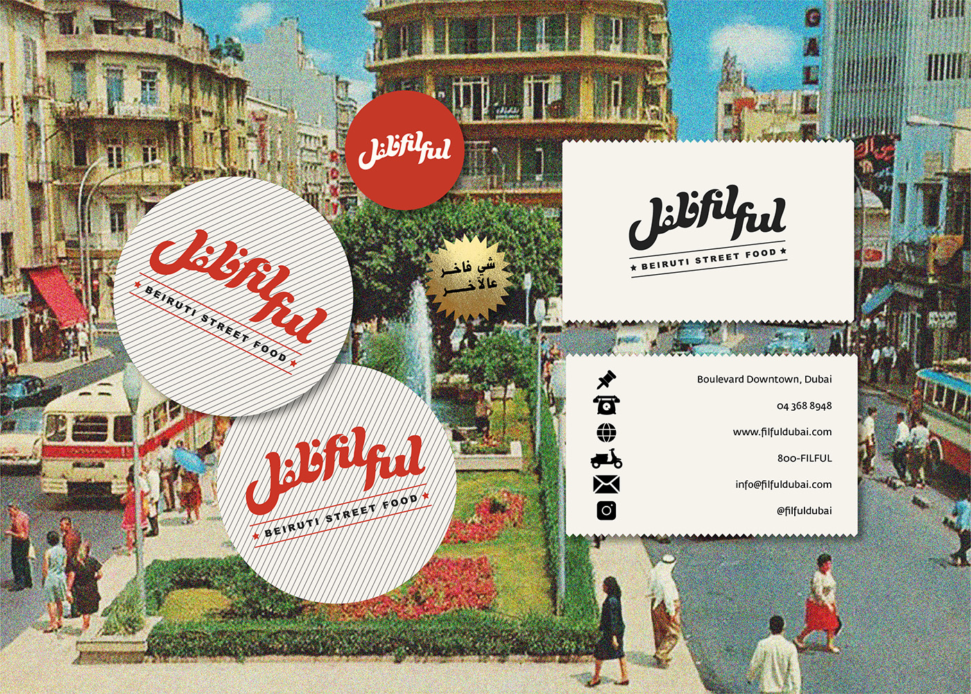 Filful is a unique Lebanese street food restaurant, located in the heart of Dubai, that mashes the old with the new, and the traditional with the hip. It is a place that promotes the Lebanese culture of gatherings, sharing and conversing where you want to be seen in, and a place that holds a special place in the Beiruti’s hearts, yet still relatable to everyone else. The tone of the brand is an approachable, effortless, “do it yourself” culture. The visual identity is inspired and stirred out from the traditional streets and small markets of Beirut. The branding design is fun and quirky accentuated with bold typography, nostalgic imagery, and loud colors, celebrating the ultimate Beiruti experience. The brand story is implemented across print collaterals, business cards, restaurant amenities, menus, and website.