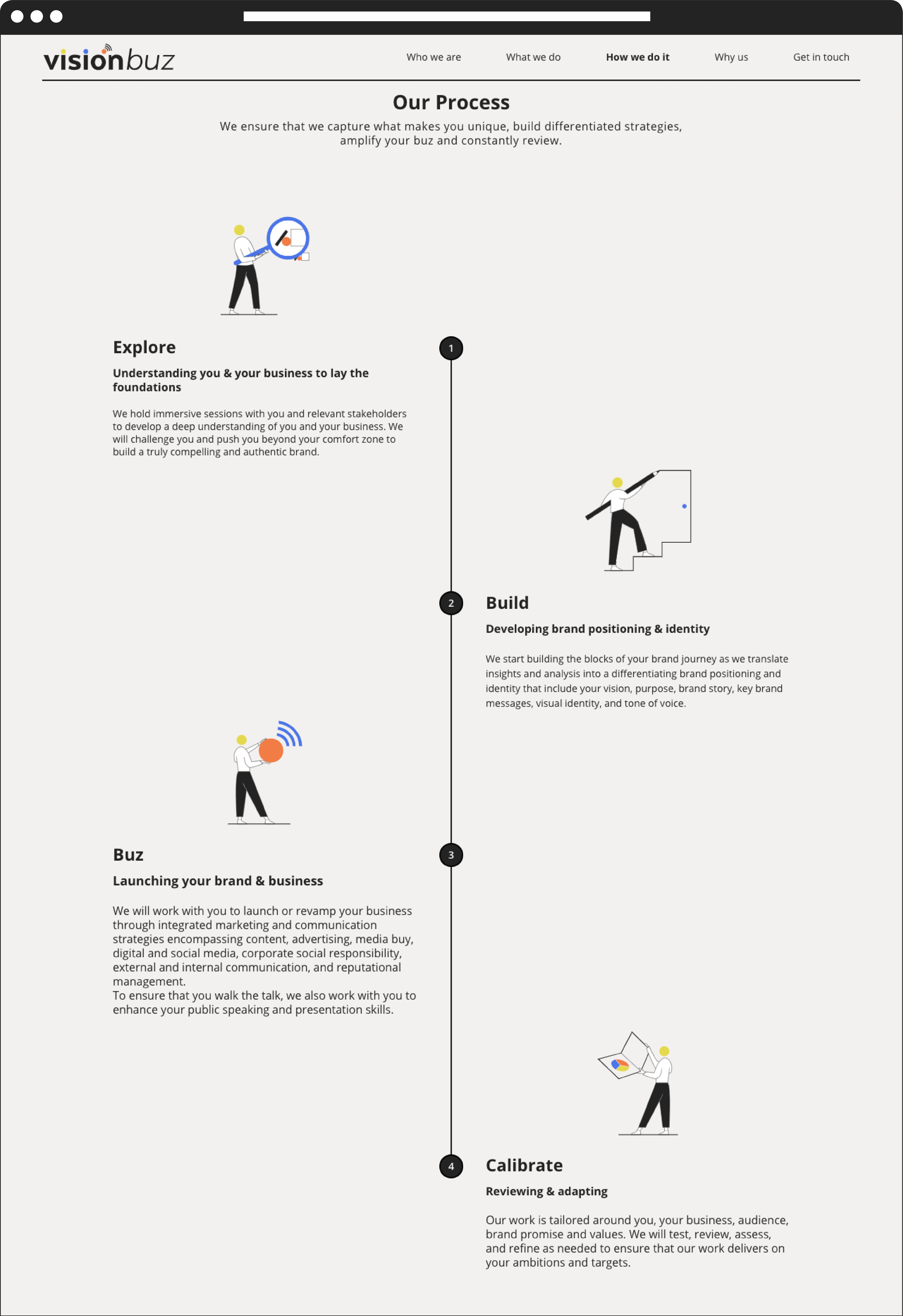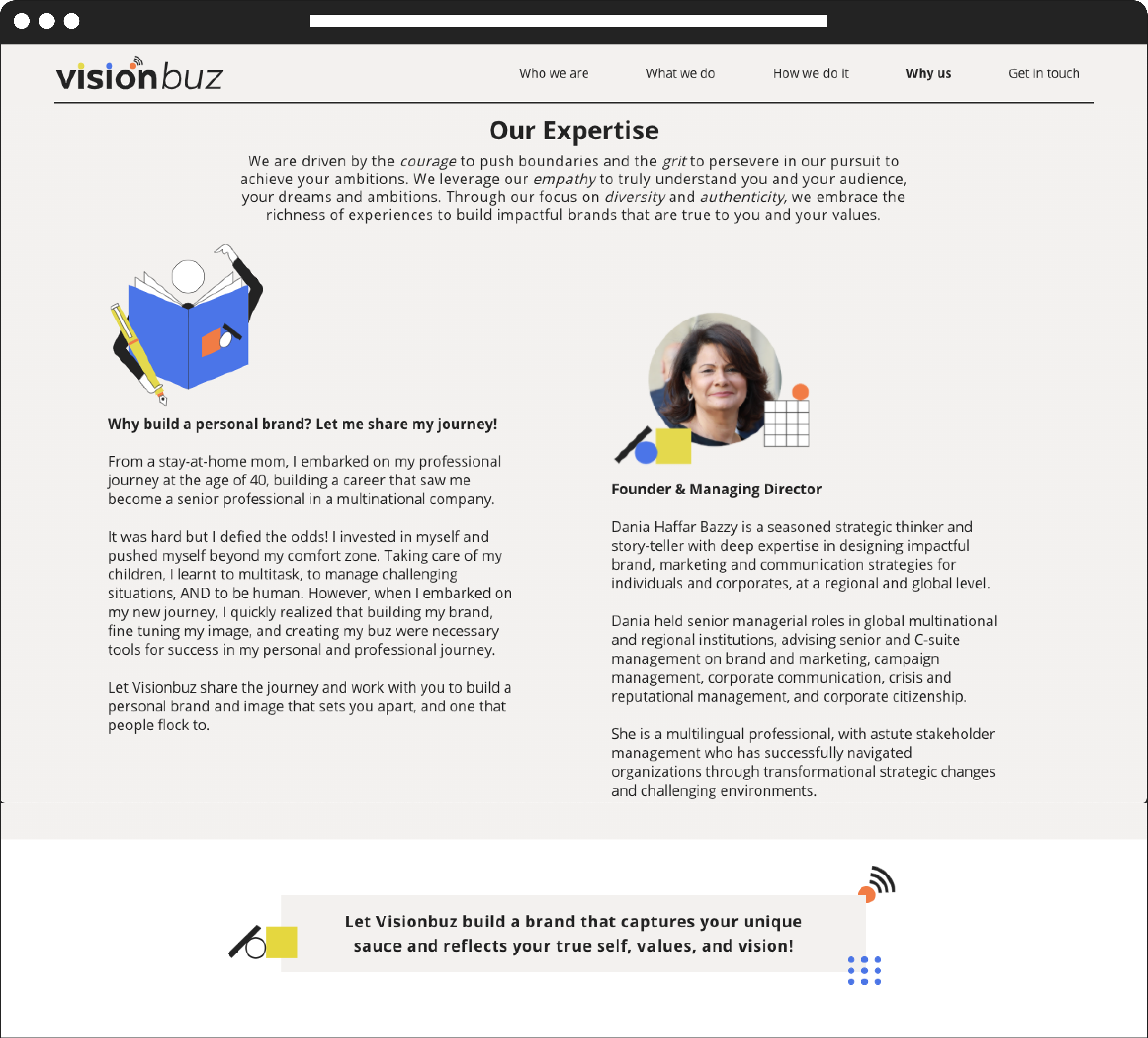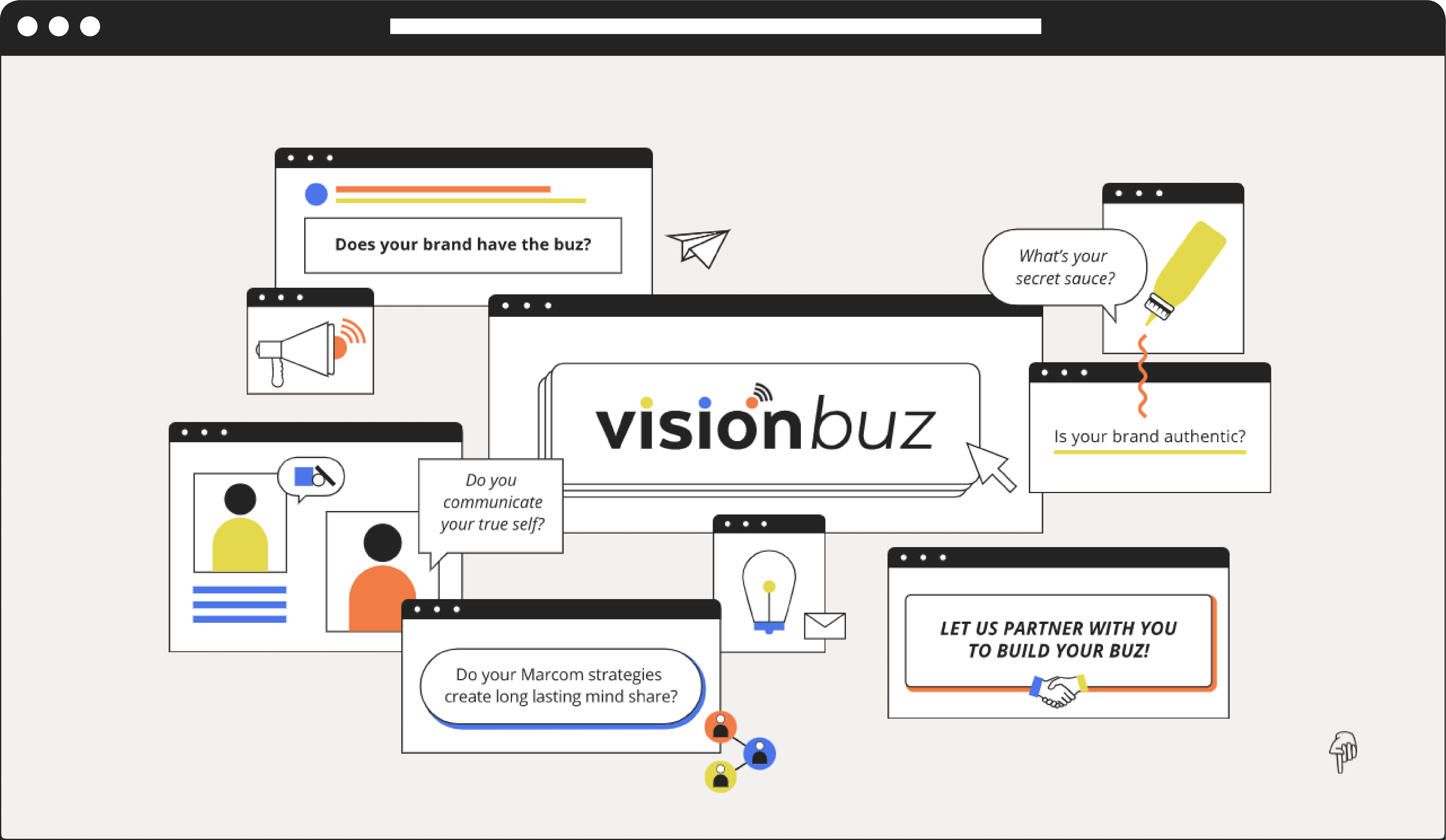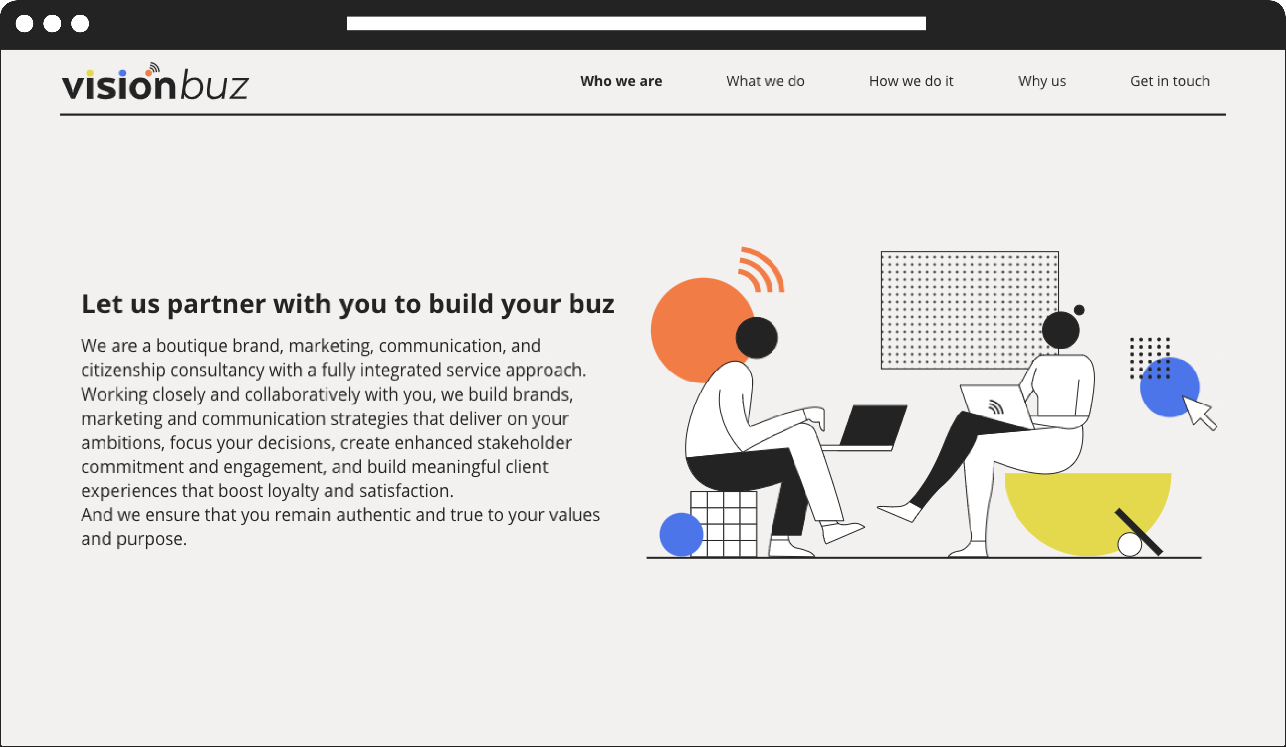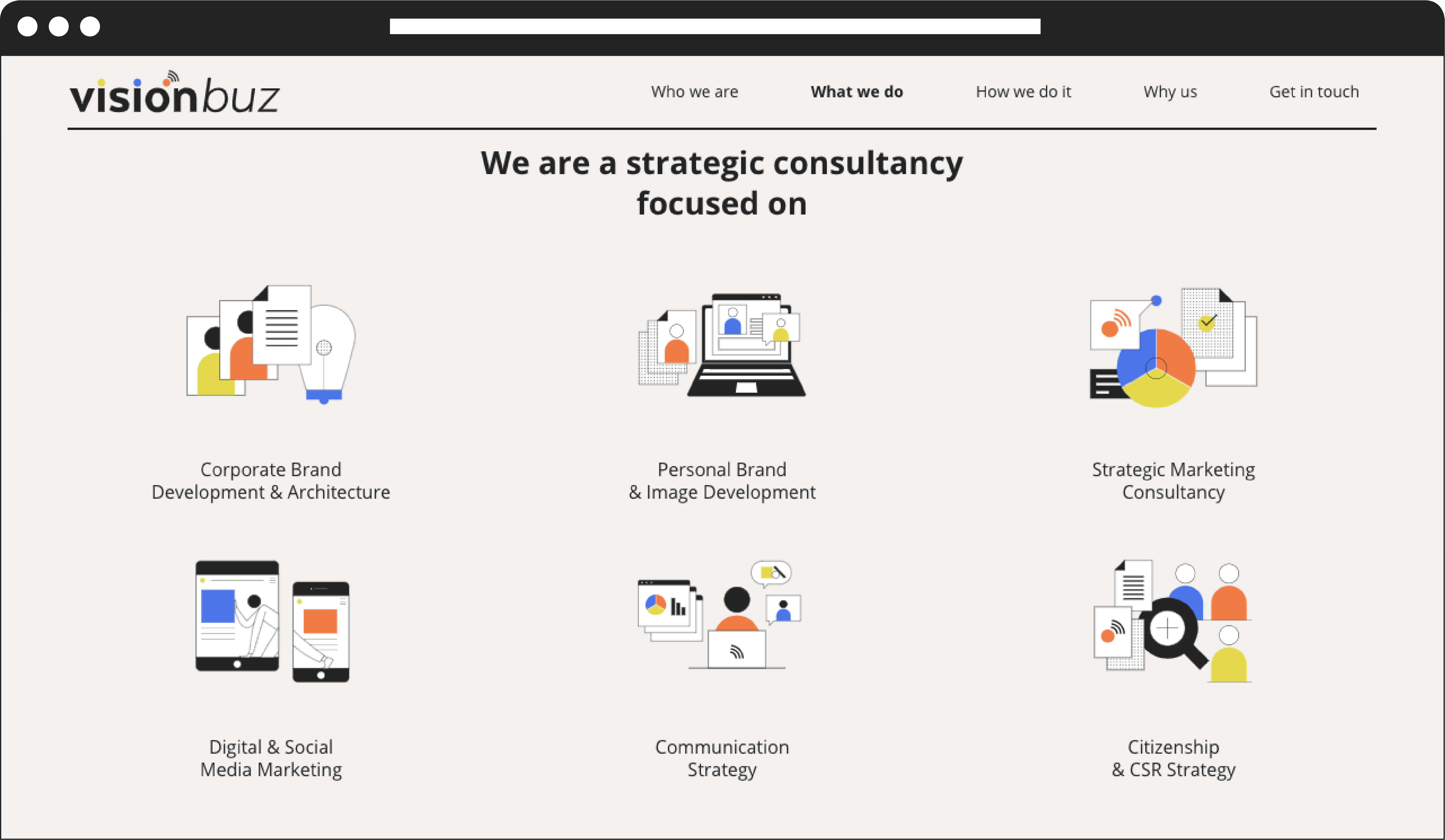 Visionbuz is a boutique brand, marketing, communication, and citizenship consultancy with a fully integrated service approach. The visual identity of Visionbuz was firstly developed through a logotype that is bold and emphatic, paired with functional marks emphasizing on the concept of a “buzz” created through different channels. The brand design reflects a corporate yet playful language, using simple shapes, lines, and block colors to tell a story with a remaining consistency throughout the brand’s deliverables. This included corporate stationeries, business cards, website, and illustration graphics.Client: Visionbuz |