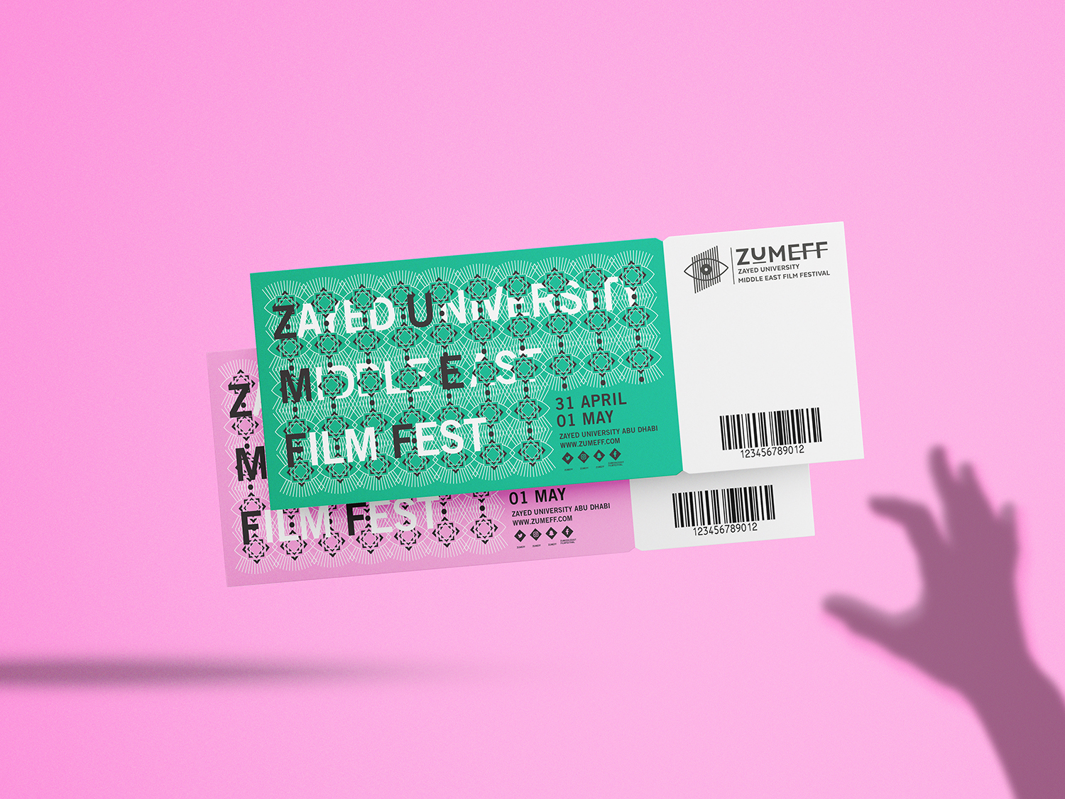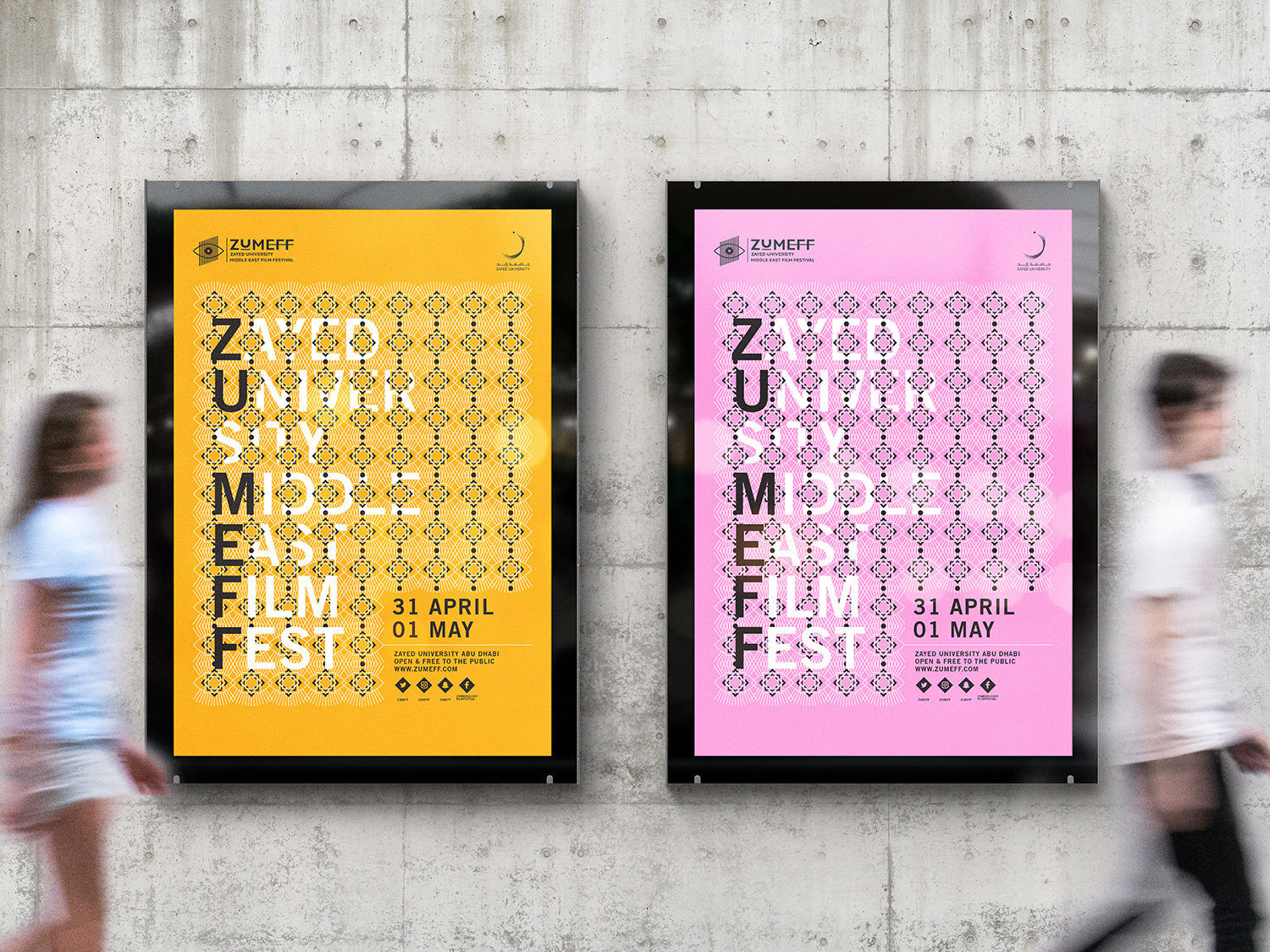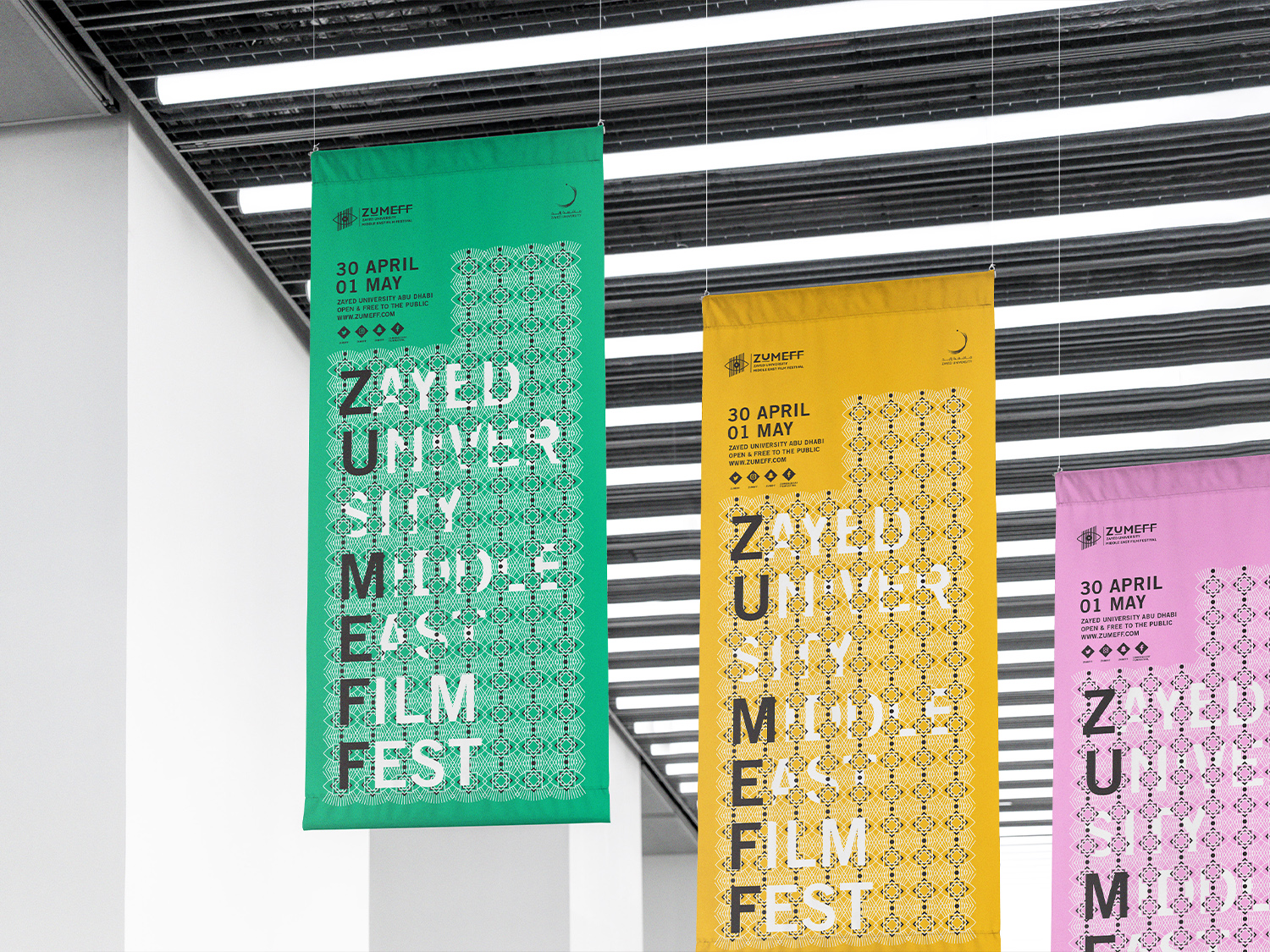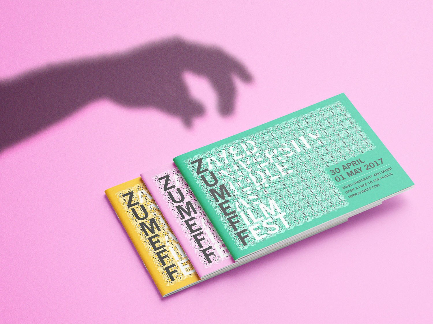 The Zayed University Middle East Film Festival (ZUMEFF) is a student film festival, hosted by Zayed University in Abu Dhabi, showcasing the best films from universities across the region, while exploring new visual grounds to represent the young generations of the UAE and fellow Arab filmmakers. With a desire to better articulate the energy and vision of the festival, a new brand identity was developed through a custom typographic logotype, matched with a minimal geometric emblem highlighting the “eye on the screen” concept. In parallel, the branding approach of the 2017 edition of ZUMEFF adopted bold yellow, pink, and green colors, combined with a pattern abstracted by a series of symbolic eyes which represent the way our vision reacts to the beam of light from a film projector. The visual identity was hence carried through signage, to print and digital elements.