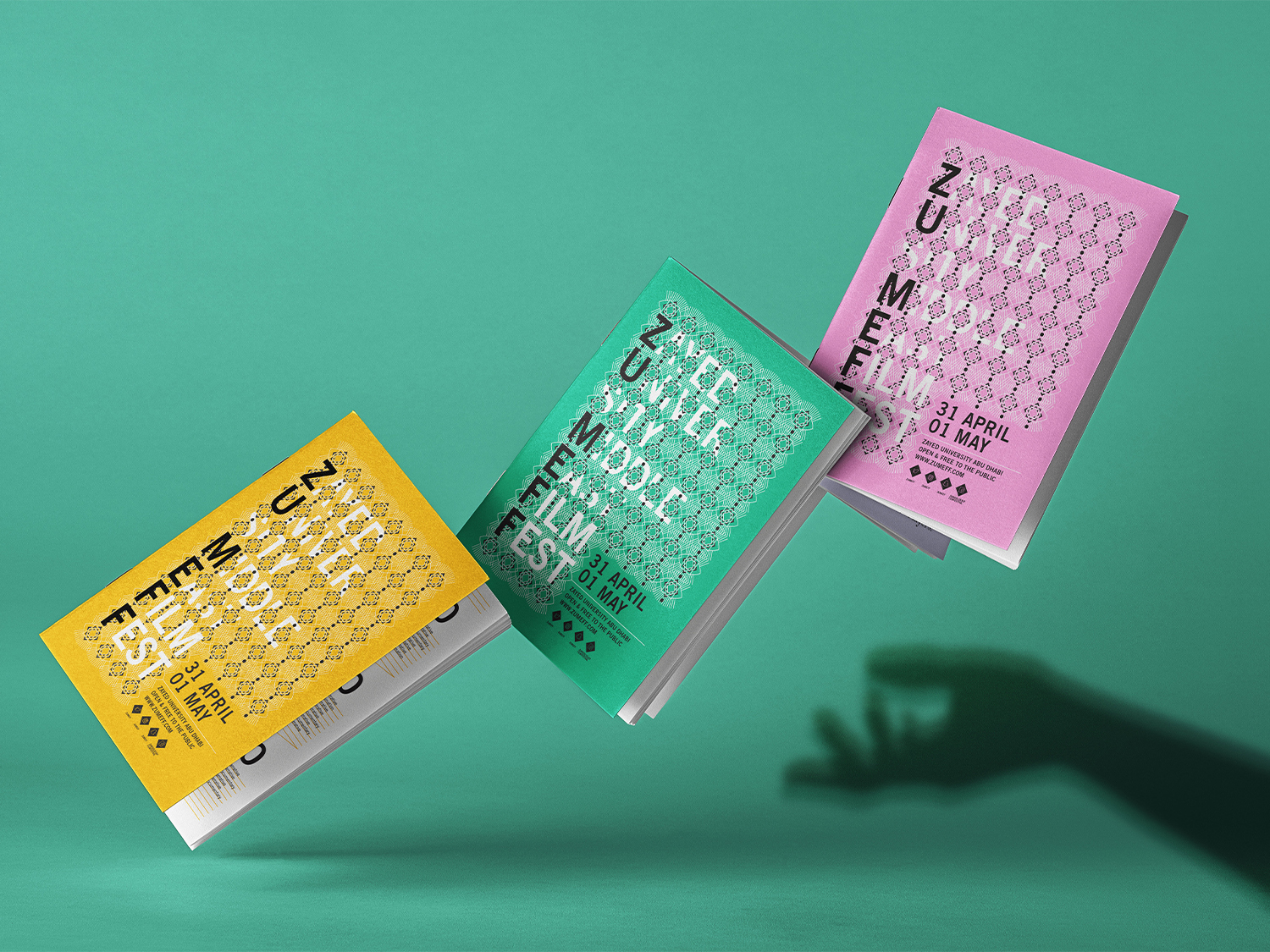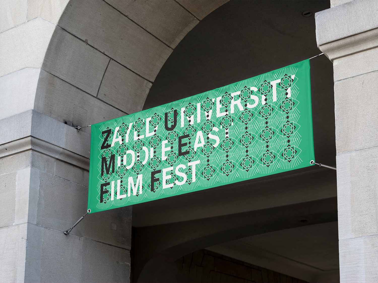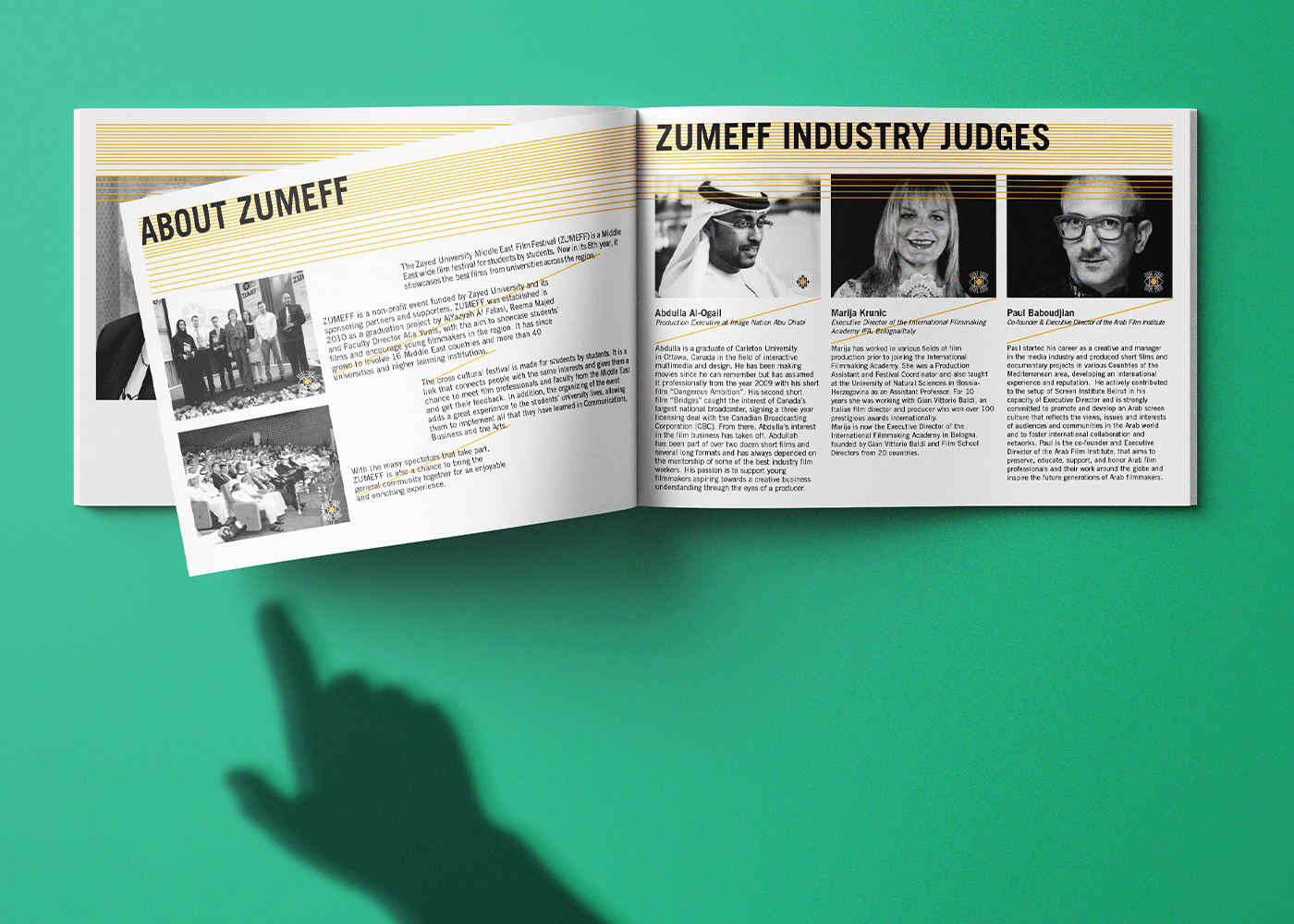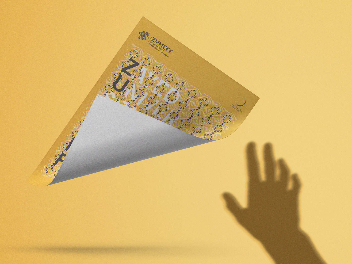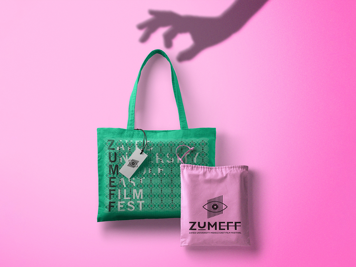 The Zayed University Middle East Film Festival (ZUMEFF) is a student film festival, hosted by Zayed University in Abu Dhabi, showcasing the best films from universities across the region, while exploring new visual grounds to represent the young generations of the UAE and fellow Arab filmmakers. With a desire to better articulate the energy and vision of the festival, a new brand identity was developed through a custom typographic logotype, matched with a minimal geometric emblem highlighting the “eye on the screen” concept. In parallel, the branding approach of the 2017 edition of ZUMEFF adopted bold yellow, pink, and green colors, combined with a pattern abstracted by a series of symbolic eyes which represent the way our vision reacts to the beam of light from a film projector. The visual identity was hence carried through signage, to print and digital elements.