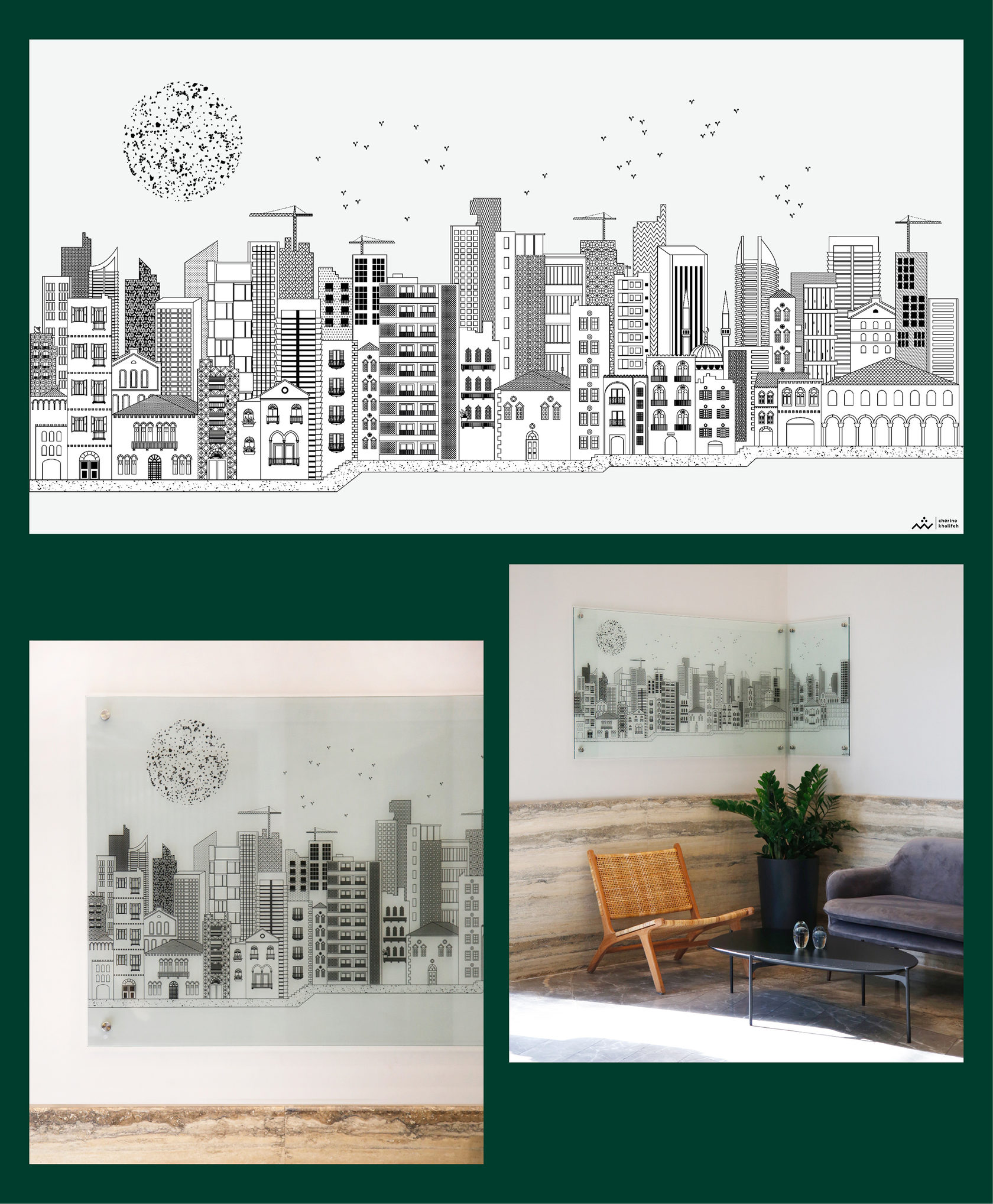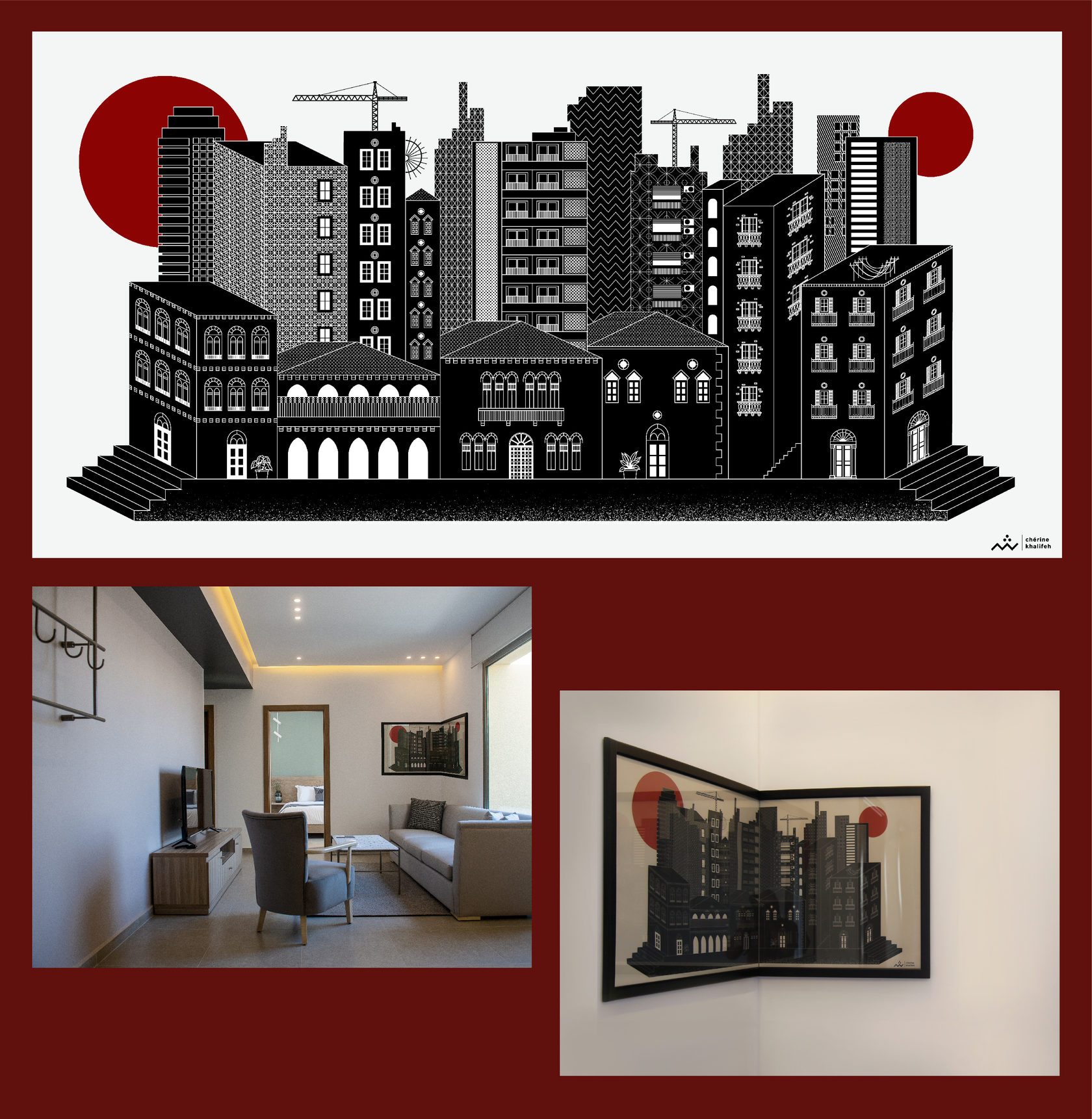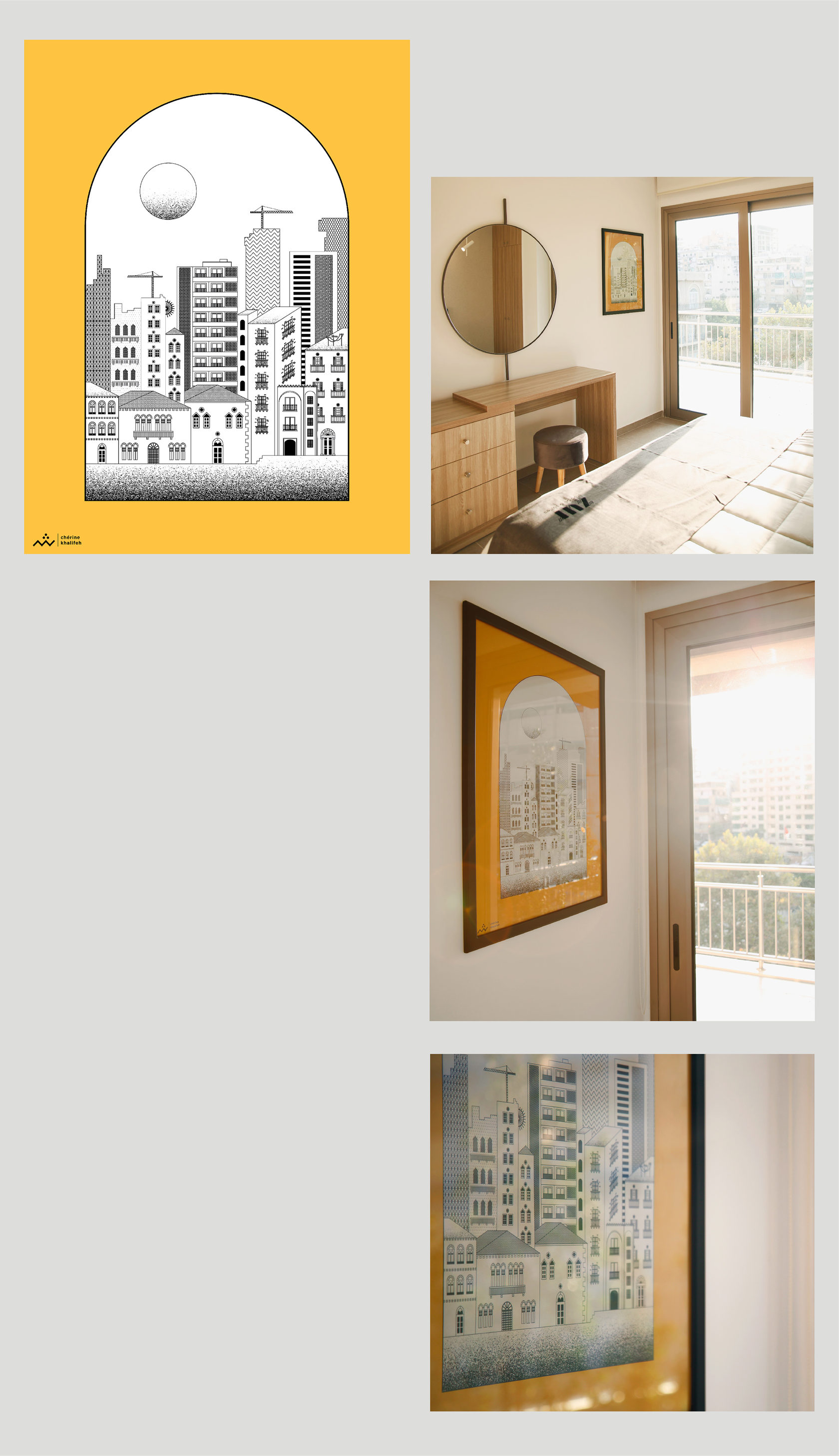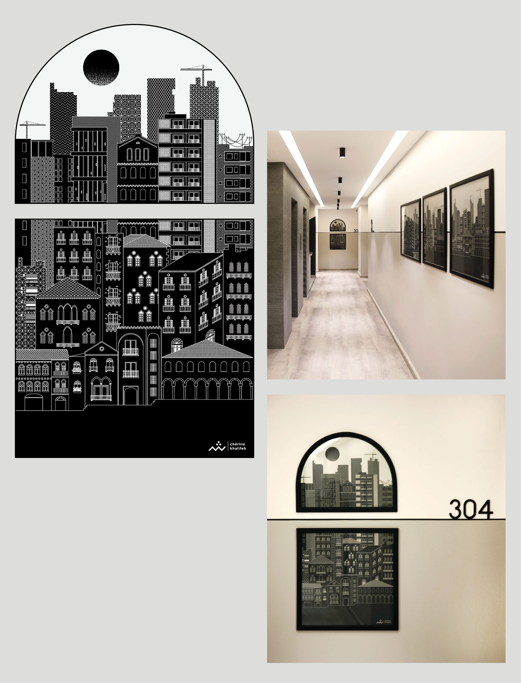 Just off Monot’s main street, Zur Beirut Studios and Suites is a centrally located serviced boutique hotel and apartment building developed by Shell+Core. A series of illustrated posters and art installations were designed to fit in the minimal, dynamic, and stylistic design of the brand and space. While keeping a modern thematic pattern blended in the traditional Lebanese architecture, the illustrations represent a contemporary deconstructed and enigmatic structure of layered and intertwined facades of iconic buildings in Beirut.