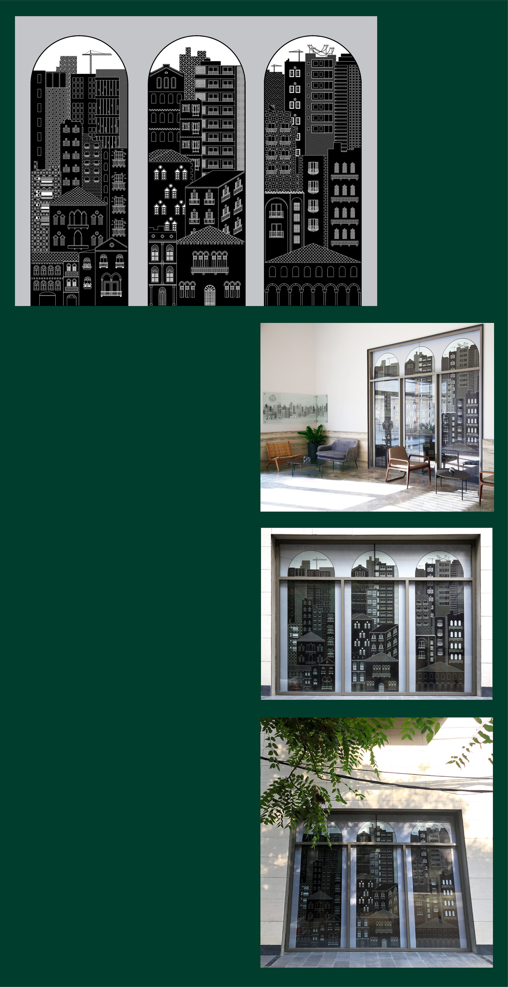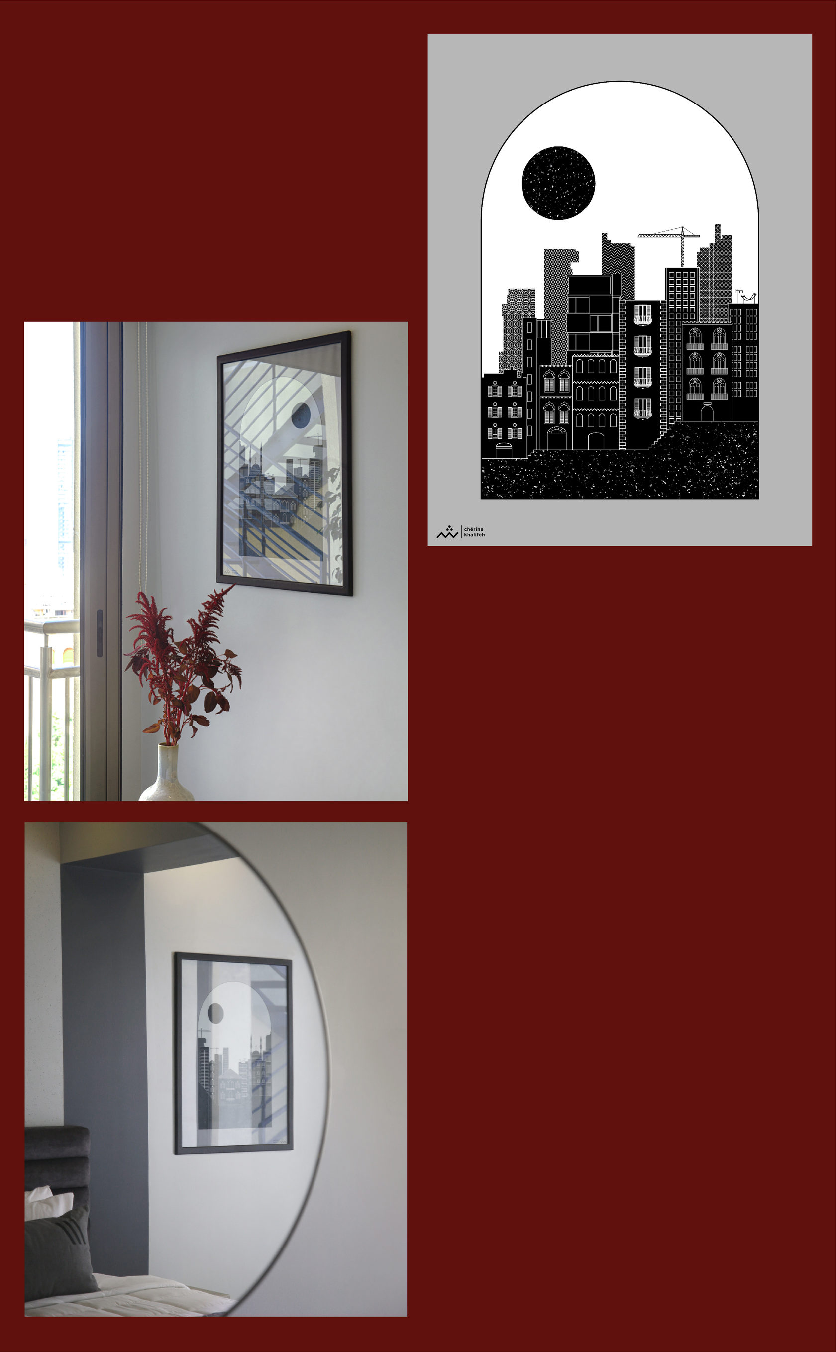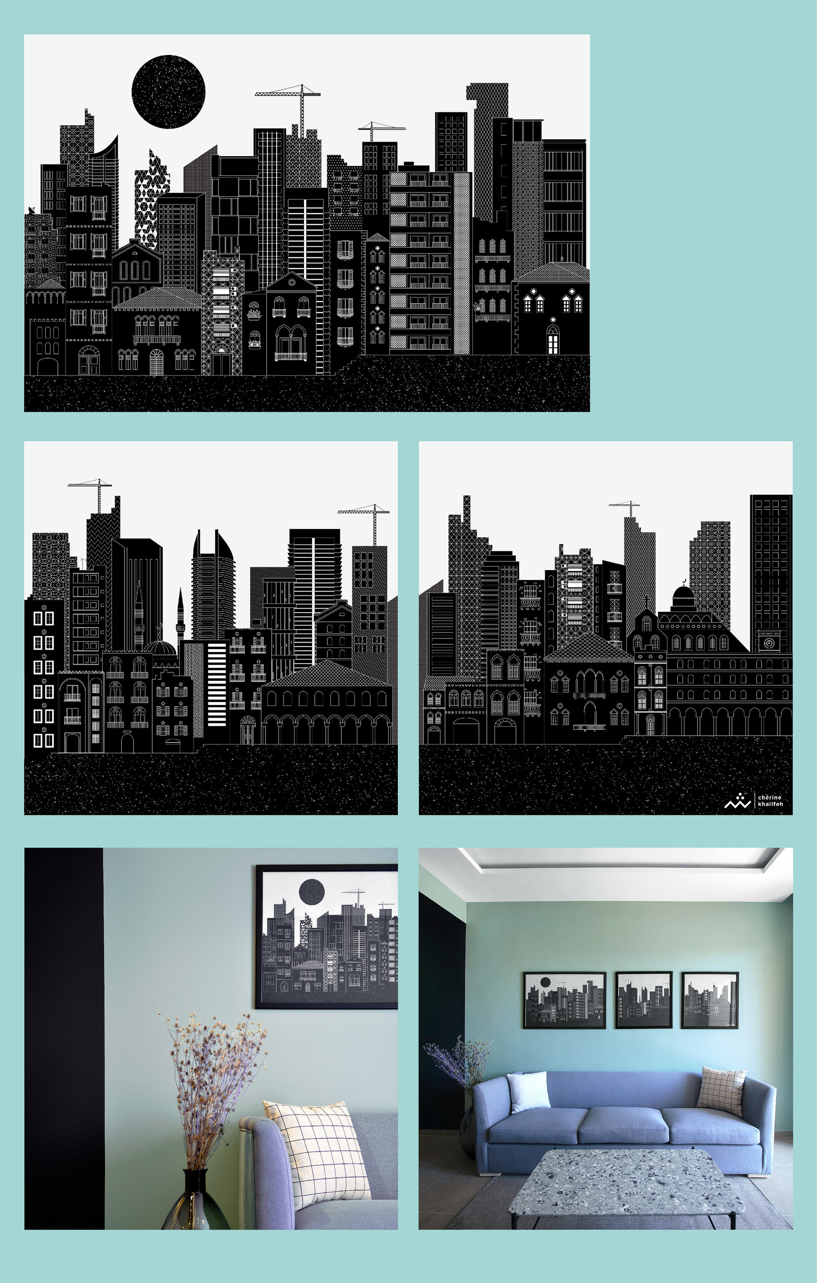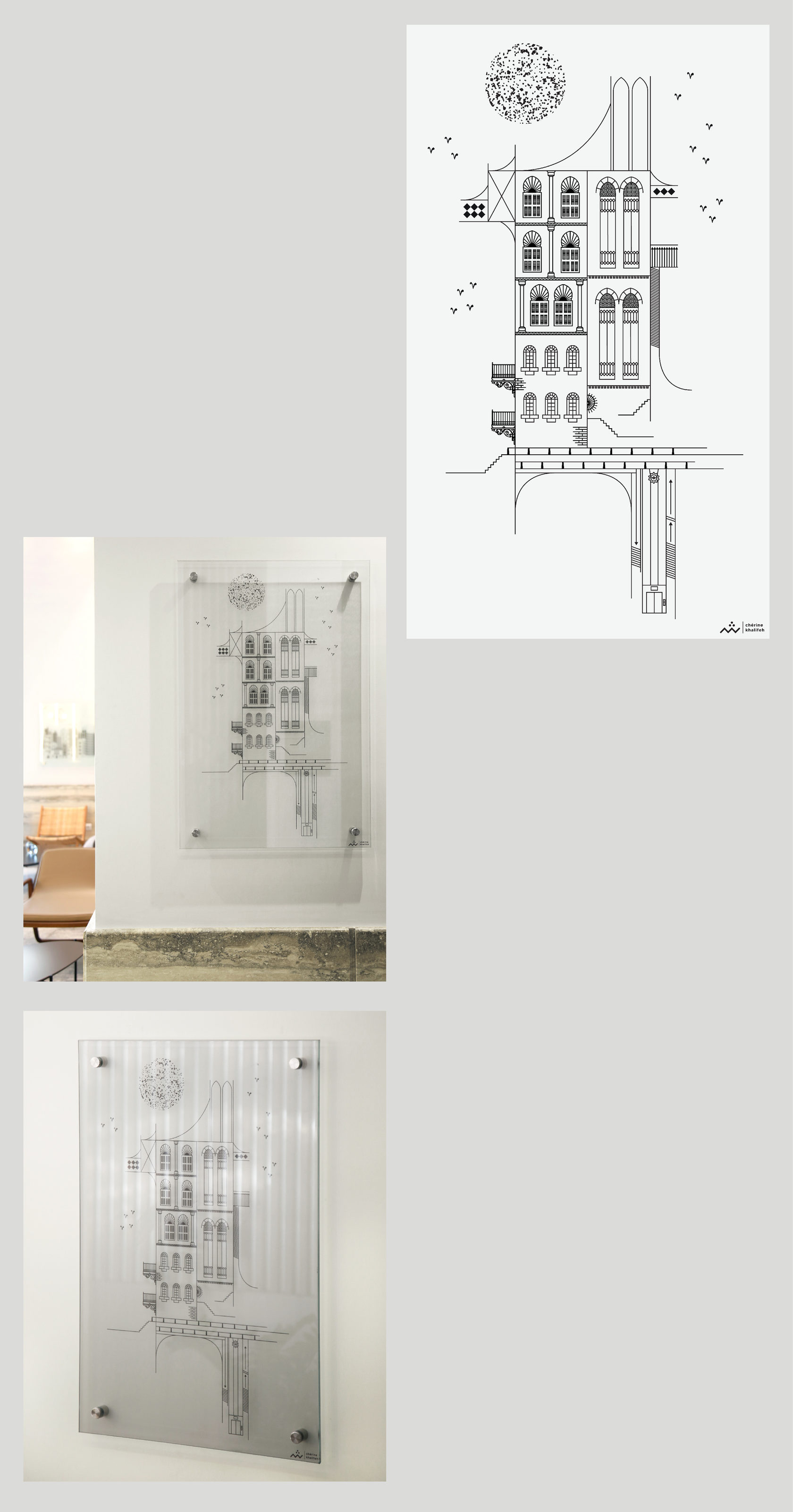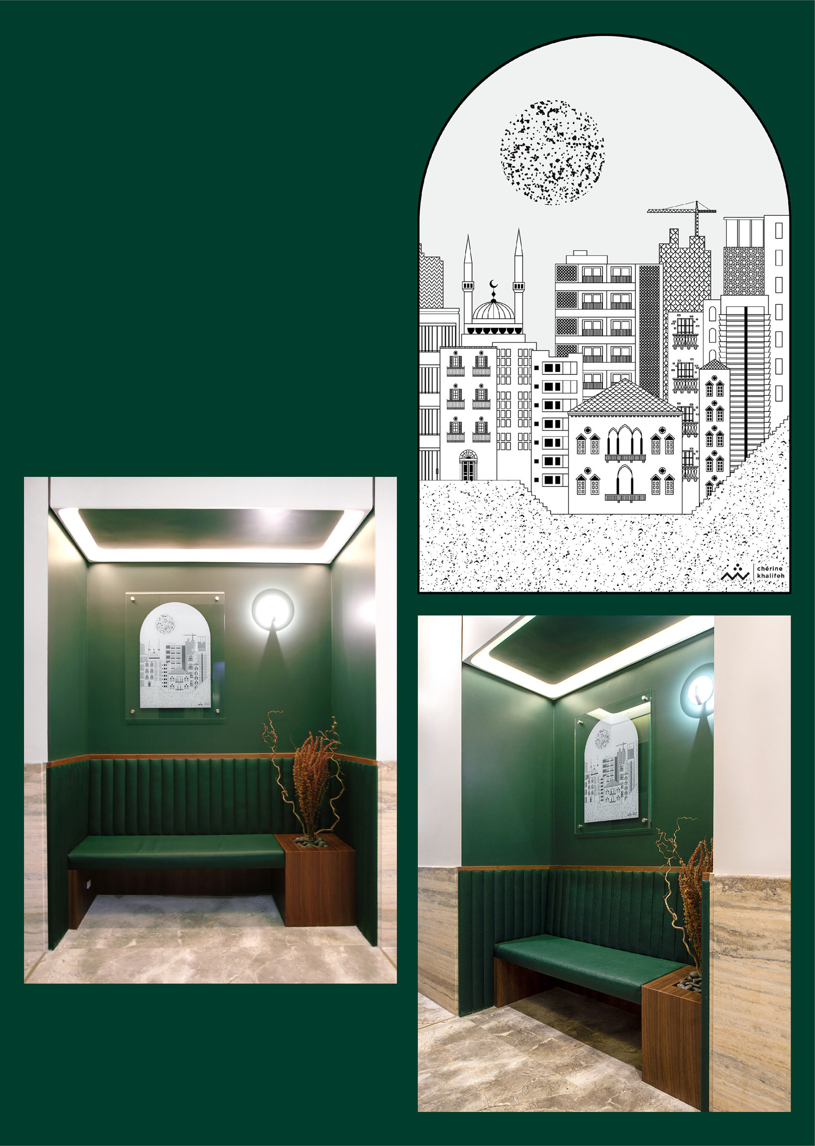 Just off Monot’s main street, Zur Beirut Studios and Suites is a centrally located serviced boutique hotel and apartment building developed by Shell+Core. A series of illustrated posters and art installations were designed to fit in the minimal, dynamic, and stylistic design of the brand and space. While keeping a modern thematic pattern blended in the traditional Lebanese architecture, the illustrations represent a contemporary deconstructed and enigmatic structure of layered and intertwined facades of iconic buildings in Beirut.